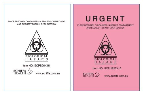 Sturdy, leak-resistant plastic material ideal for transporting samples from clinic to lab. Two handy pockets for paperwork and scripts and colour coded based on urgency; clear for standard and pink for urgent.