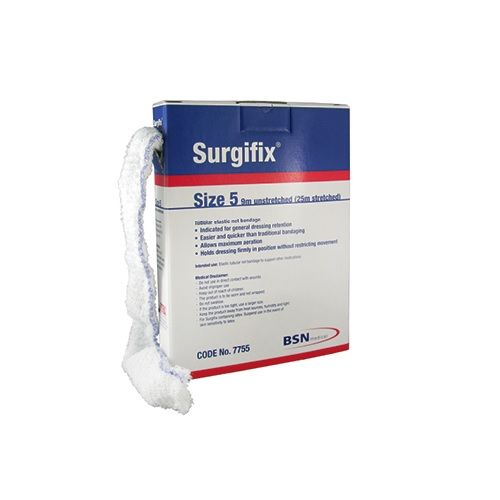 Surgifix is a soft, white, elastic net bandage knitted from polyester, polyamide and latex yarns. The special construction ensures that it can be stretched without shrinking or distorting and minimises torniquet effect. It is available in 8 sizes and can be stretched to 25m in length.