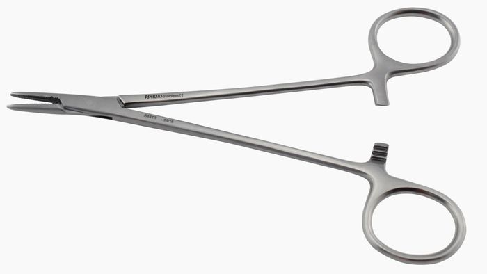 The Crile-Wood needle holder has a racheted finger ring handle, tapered blunt tip.