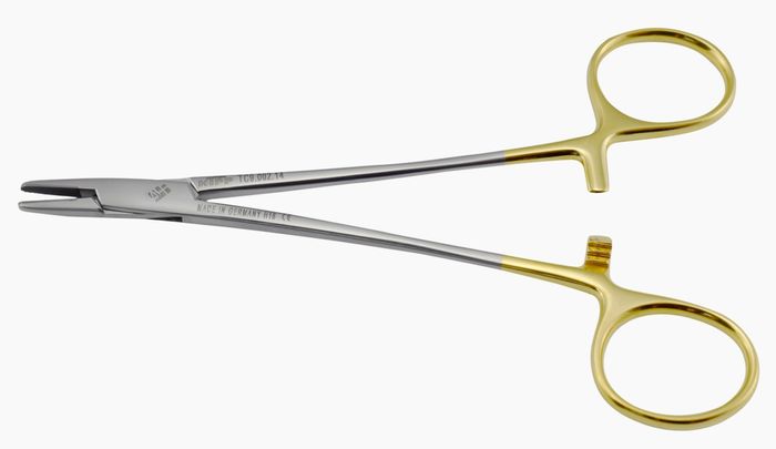 Mayo-Hegar is used to hold and manipulate curved needles during surgical procedures. This is a heavy needle holder with a mildly tapered tip and no cutting blade.