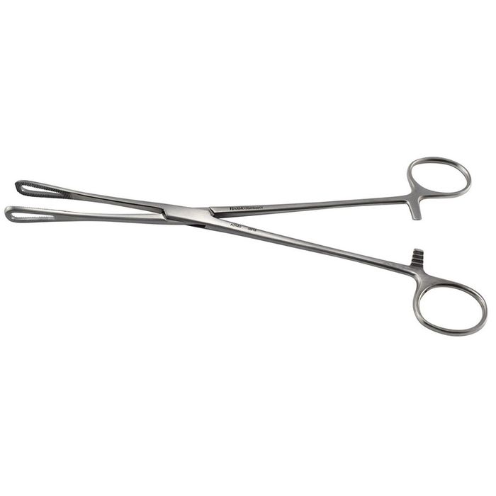 These forceps hold sponges for situations such as when a patient's skin needs to be prepared prior to surgery. The jaws themselves are elongated and contain serrated tips to hold swabs or sponges and reduce the chance of slippage.