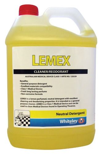 Lemex is an inexpensive lemon perfumed liquid suitable for general use as a cleaner or deodorant. Lemex is suitable for surface cleaning and use on other Class 1 Medical Devices and has been entered onto the Australian Register of Therapeutic Goods (ARTG). Using Lemex as directed ensures Healthcare facilities comply with current healthcare regulations.