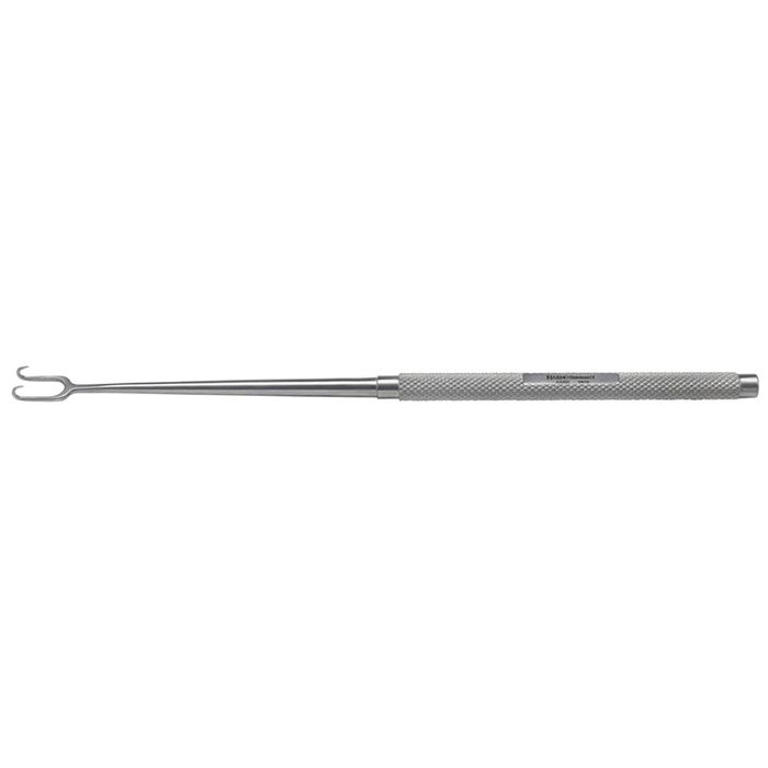 This handheld retractor commonly used for holding back the edges of skin during intranasal and pharyngeal procedures. It is available with a double prong, sharp hook. The handle is often round and knurled and it tapers to the hook end.