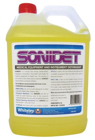 Sonidet® is a highly active NEUTRAL liquid detergent specifically designed for both machine and manual cleaning operations in the medical field. Sonidet® is odourless, non-staining and is a safe detergent for the removal of hospital and surgical soils. Diluted solutions of Sonidet® are colourless. Its concentrated formula provides rapid cleaning action and effectiveness in hard and soft water.